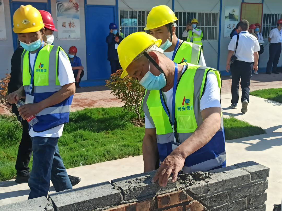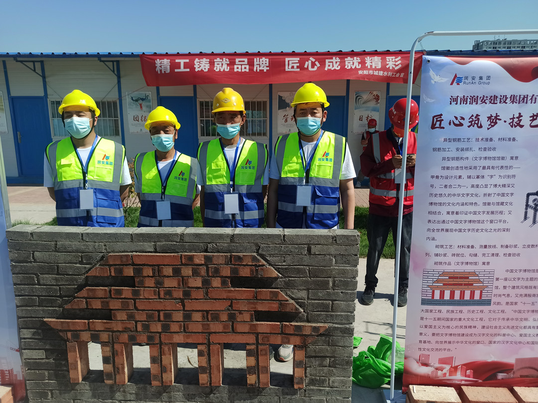 本次技能展示活動(dòng)設(shè)置了鋼筋綁扎和砌筑兩個(gè)項(xiàng)目,我公司派遣八名職工代表參加了本次技能展示,選手們身著統(tǒng)一工作服,以嫻熟的操作技能展現(xiàn)了過硬的技術(shù)水平。砌筑工速度與質(zhì)量并重,一手拿著泥刀,一手不停地一塊塊砌磚,每一道工序、每一個(gè)細(xì)節(jié)都力求做到完美,最終圓滿完成了砌筑作品《文字博物館》。鋼筋工粗中有細(xì),在大面積作業(yè)的同時(shí),即時(shí)進(jìn)行細(xì)節(jié)處理,確保作品垂直、平整,經(jīng)過一系列的復(fù)雜操作,一個(gè)完美的安陽文字博物館館徽便呈現(xiàn)在眼前。高超的技藝水平贏得了領(lǐng)導(dǎo)和現(xiàn)場觀眾的一致稱贊。